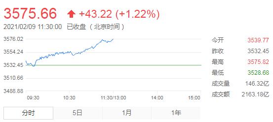 截止午間收盤,滬指漲1.22%,報3575.66點,深成指漲1.88%,報15556.19點,創業板指漲1.58%,報3329.99點。兩市成交額4930.2億元;北上資金實際淨流入5.61億元。兩市61股漲停,12股跌停(含ST)。