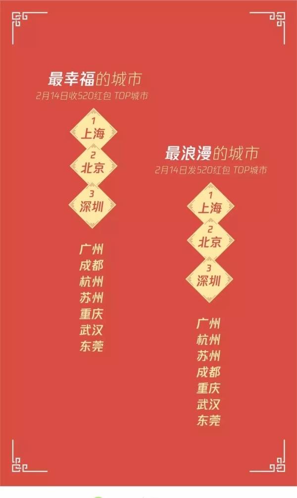 數據顯示,最浪漫的城市(2月14日發520紅包)TOP10中,上海位居第一,北京、深圳分別位列第二、第三。最幸福的城市(2月14日收520紅包)TOP10中,上海依舊位列第一,北京、深圳還是前三。