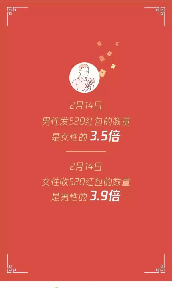 2月14日,單個用戶收到520紅包的最多超過200個,單個用戶發出520紅包的最多超過150個。其中,男性發520紅包的數量是女性的3.5倍,女性收520紅包的數量是男性的3.9倍。