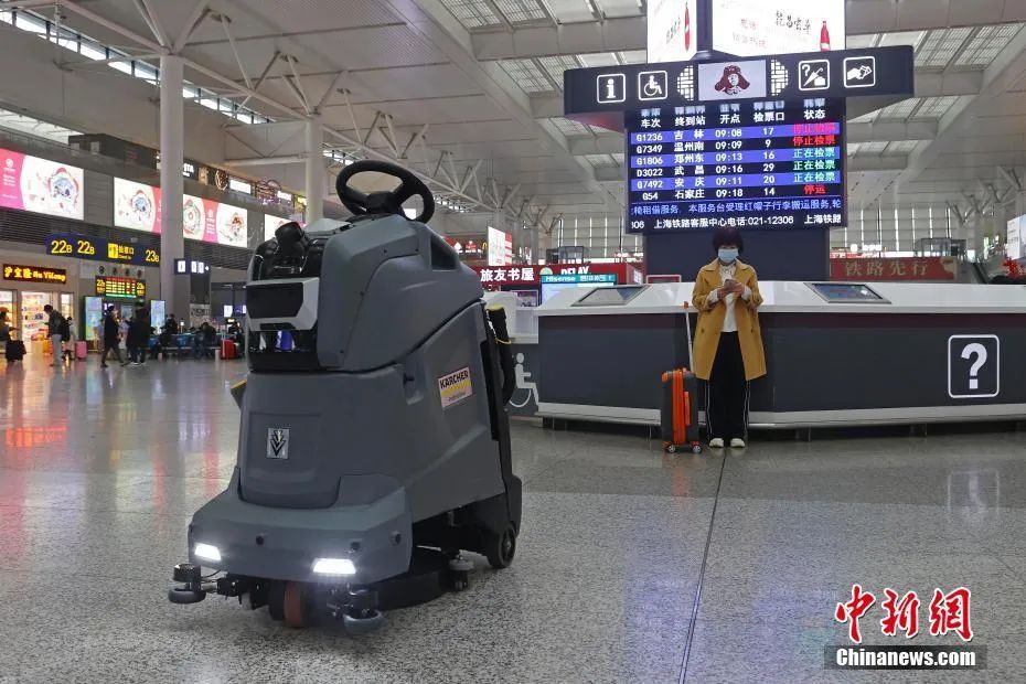 無人機械人在鐵路上海虹橋站內一邊保潔、一邊進行消毒作業。