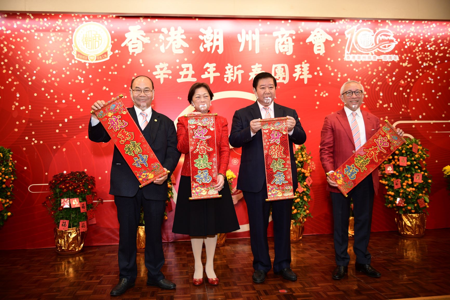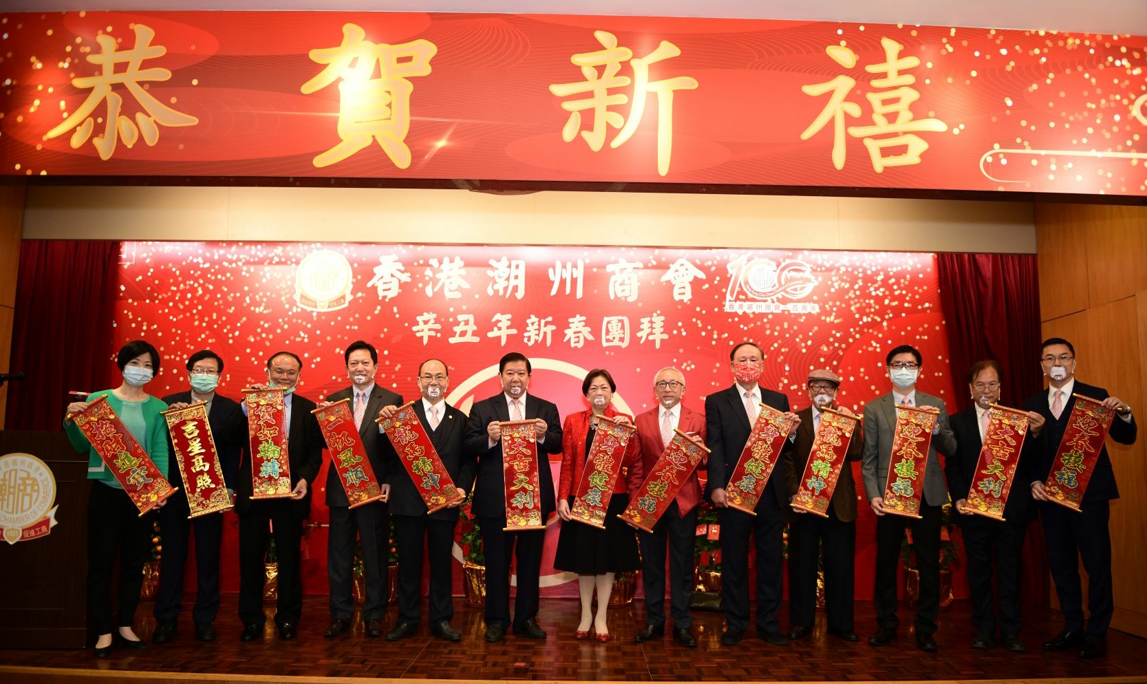 中聯辦港島工作部部長薛惠君、中西區民政事務專員梁子琪擔任主禮嘉賓,全國政協常委、潮州商會榮譽主席胡定旭,永遠名譽會長陳偉南、陳幼南、胡劍江;名譽會長藍鴻震,榮譽顧問高永文、梁劉柔芬,香港潮州商會百周年慶典活動委員會顧問郭一鳴等向各界拜年。黃書銳聯同副會長陳智文、馬鴻銘、高佩璇、鄭敬凱,蔡少偉和陳強向來賓拜年,祝賀大家金牛迎春,萬事如意!