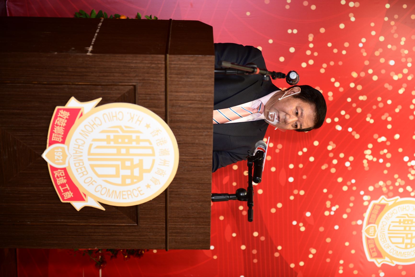 黃書銳致新年賀辭時感謝歷屆資深會長對商會的指導,全體會董對商會的鼎力支持和會員的參與。他說,過去一年有賴各會董、會員及鄉親響應國家號召,參與「一帶一路」倡議及粵港澳大灣區的建設;支持香港政府依法施政,推動香港發展重回正軌;面對新型冠狀病毒肺炎蔓延,搜購口罩及各類物資捐贈至不同團體和地區,與香港巿民疫境同行,共渡時艱。商會仝人積極參與會務,貢獻良多。