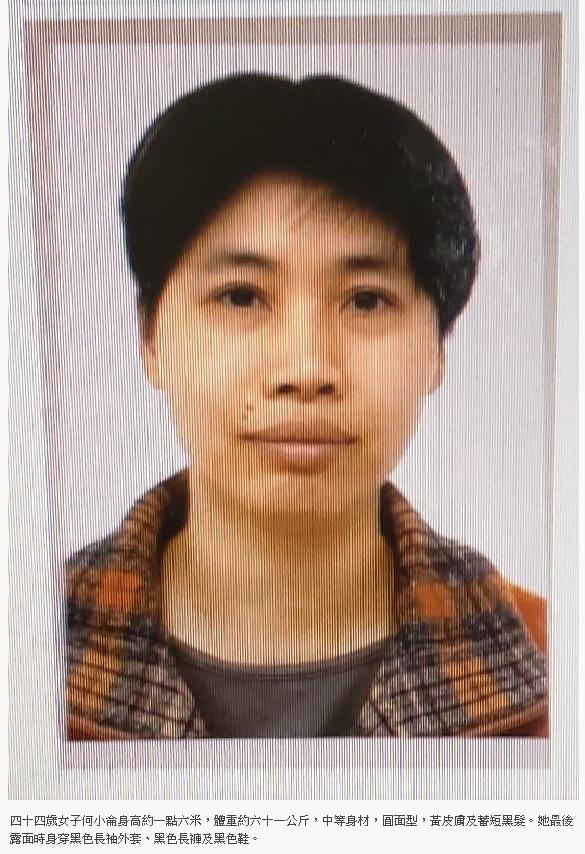 44歲女子何小侖昨日(19日)下午於祟仁街一公廁外最後露面後便告失蹤,其家人同日向警方報案。