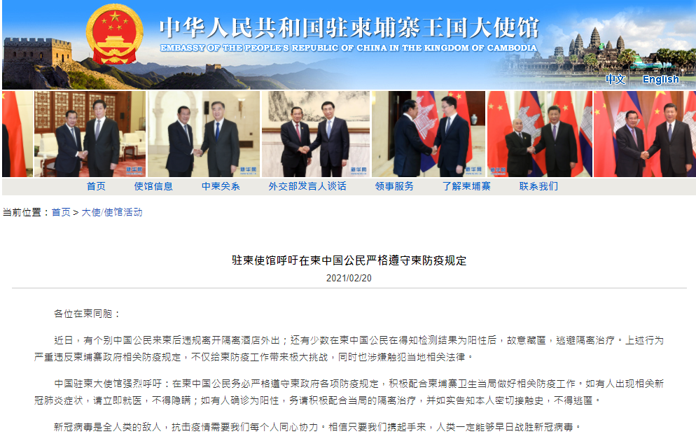 據法新社消息,發現病例是因為柬埔寨境內一批中國公民為申請出境接受新冠病毒檢測。洪森在講話中強調,「這發生在中國公民身上,(但)請不要歧視中國人。」