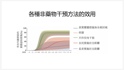 圖為各種非藥物干預方法對所有年齡群組的累積感染個案的效用。