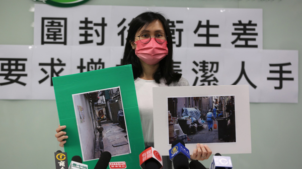 深水埗區議員鄒穎恒指,她在農曆新年前後到達曾被圍封的深水埗區域,並發現幾處人流頻繁的地點都有垃圾堆積、更有後巷充斥污水,因此她促請當局增加清潔工人人數,加快清理垃圾和污水,以保障市民健康及防止新冠肺炎病毒傳播。