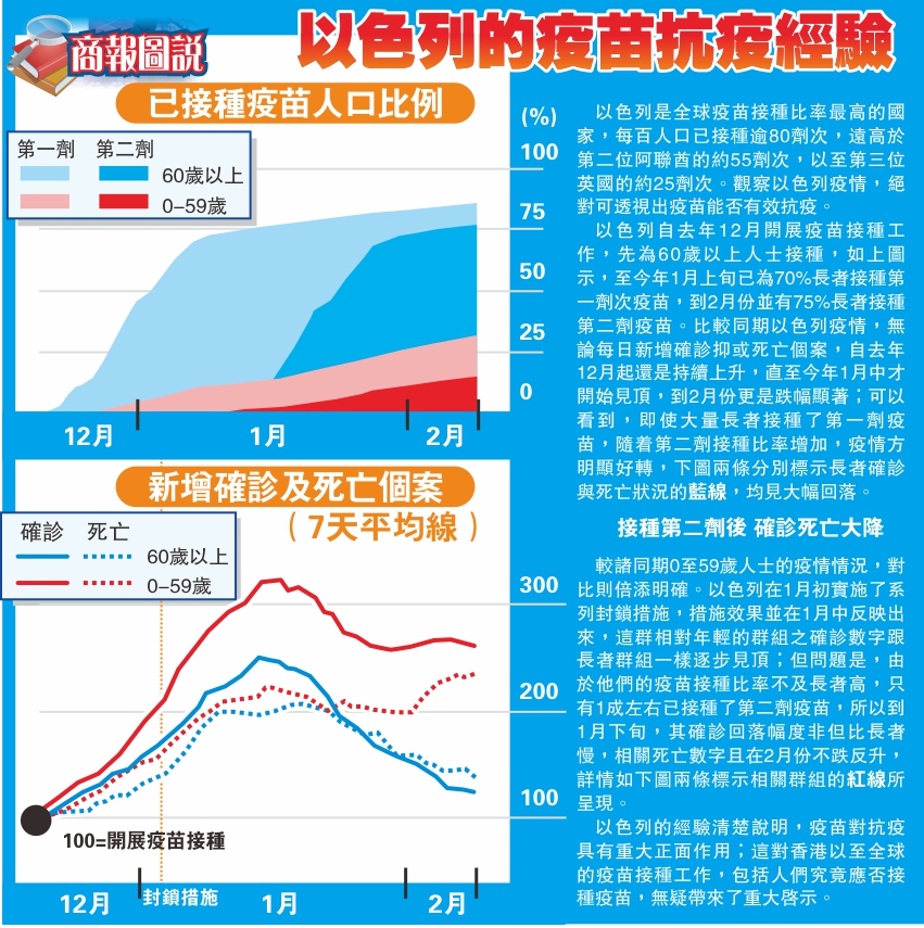 以色列是全球疫苗接種比率最高的國家,每百人口已接種逾80劑次,遠高於第二位阿聯酋的約55劑次,以至第三位英國的約25劑次。觀察以色列疫情,絕對可透視出疫苗能否有效抗疫。