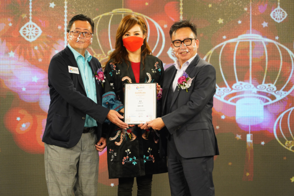 格林薈主席周博士及執行總監劉博士於新春團拜中頒發委任證書,委任慈善大使羅霖為「朋輩輔導 · 老友所為 · 傾吓計」計劃親善大使。
