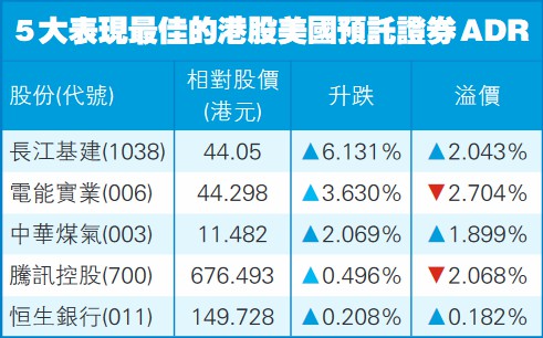 大型藍籌ADR上周五個別發展,滙豐控股(005)收報46.09元,較港收市跌1.21元;騰訊控股(700)收報676.36元,較港收市升13.86元。另外,紐交所在上周五收市後宣布,將啟動中海油(883)ADR的除牌程序,多隻中概股包括阿里巴巴(9988)、百度及微博上周五下跌1%至3%。