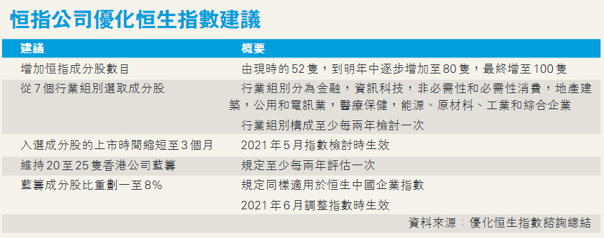 是次改革恒指組成的其中一個特點就是,把香港公司在恒指的數目佔比,鎖定在20至25隻,而且,香港藍籌公司數目會至少每兩年評估一次。黃偉雄估計,是次恒指改革初期,香港公司在恒指的佔比仍會達到三分之一,但由於現時大型新股多來自內地,日後內地企業佔恒指的比例仍會提升。