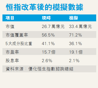 恒指公司模擬推算,恒指成分股總市值將由現時約26.7萬億元,增加至約33.4萬億元;市值覆蓋率由目前的56.5%提升至71.2%。至於恒指市盈率,則由目前的15.7倍增至19.1倍。