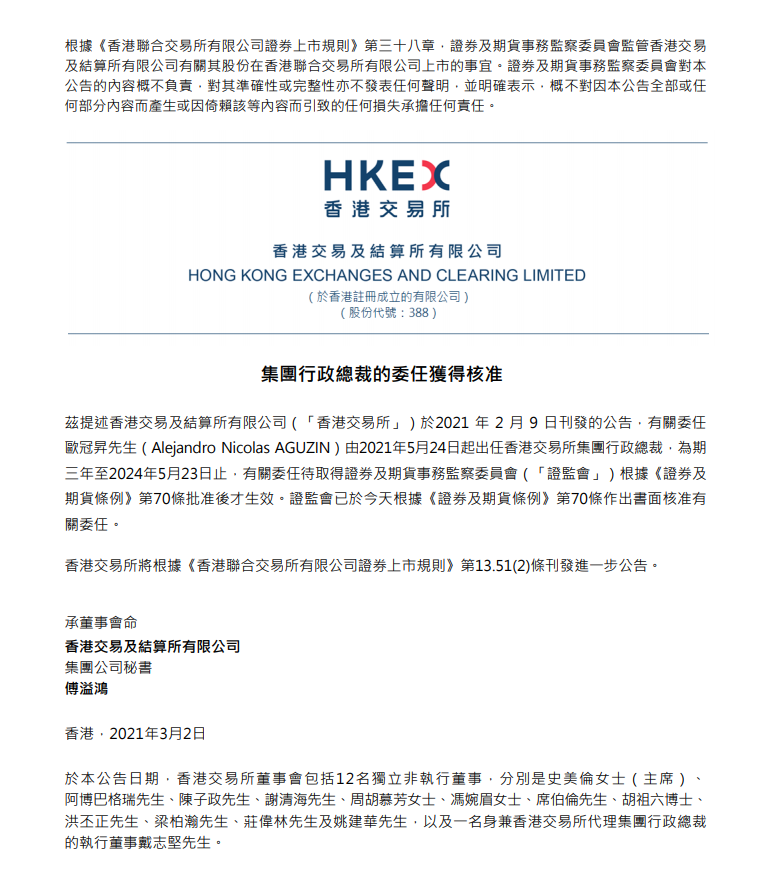 2日,港交所發公告指,歐冠昇的行政總裁委任,已取得證監會根據《證券及期貨條例》第70條作出書面核准。