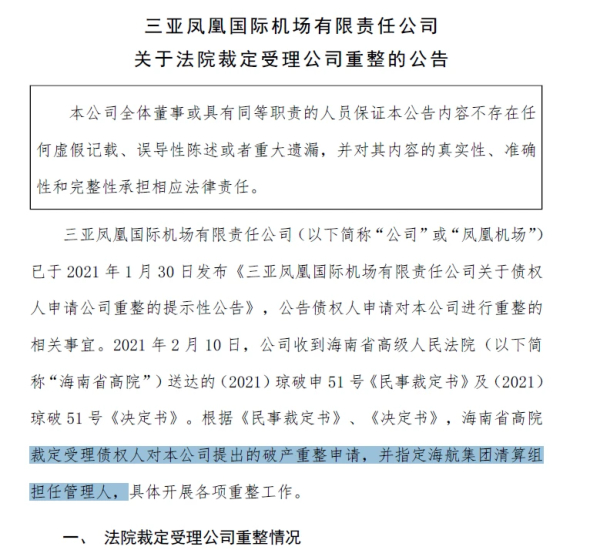 根據海南省高院發布的(221)瓊破44-64號公告,三亞鳳凰國際機場有限責任公司的債權人應於2021年3月31日前向管理人申報債權。海南省高院指定海航集團清算組擔任管理人。三亞鳳凰機場重整案第一次債權人會議將於2021年4月13日上午9:00在最高人民法院全國企業破產重整案件信息網採取網絡方式召開。