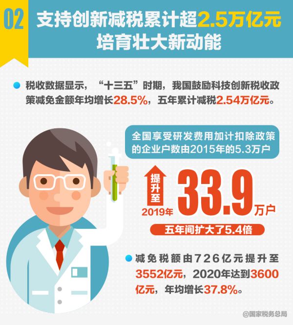 稅收數據顯示,「十三五」時期,我國鼓勵科技創新稅收政策減免金額年均增長28.5%,五年累計減稅2.54萬億元。稅收優惠更多惠及製造業和高技術服務業,製造業、信息傳輸和信息技術服務業、科學研究和技術服務業三大行業享受減稅額合計佔比近九成。