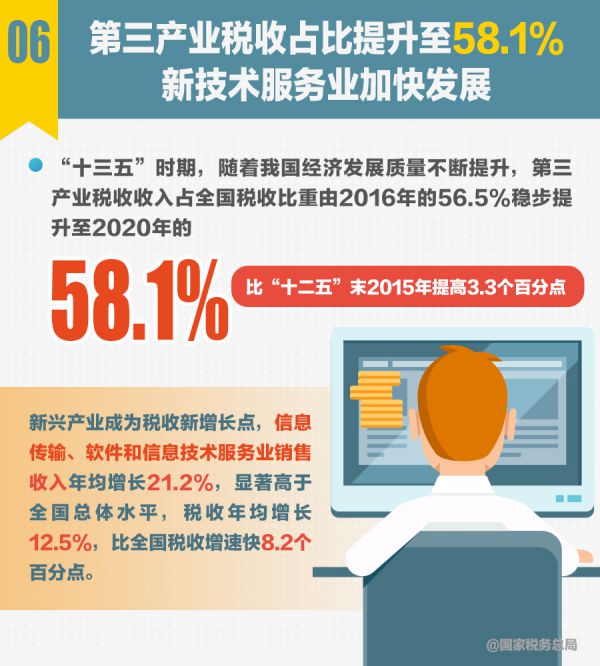 稅收數據顯示,「十三五」時期,隨着我國經濟發展質量不斷提升,第三產業稅收收入佔全國稅收比重由2016年的56.5%穩步提升至2020年的58.1%,比「十二五」末2015年提高3.3個百分點。新興產業成為稅收新增長點,信息傳輸、軟件和信息技術服務業銷售收入年均增長21.2%,顯著高於全國總體水平,稅收年均增長12.5%,比全國稅收增速快8.2個百分點。