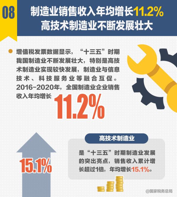 「十三五」時期,包括稅收優惠在內的各項政策扶持力度的持續加大,有力促進新經濟新動能蓬勃發展,推動現代產業體系加快構建。稅收數據顯示,數字經濟相關行業快速成長,2016-2020年,稅收年均增長7.2%,快於全國總體水平3個百分點。增值稅發票數據顯示,「十三五」時期,核心基礎零部件、先進基礎工藝、關鍵基礎材料和產業技術基礎等「四基」產業龍頭企業銷售收入從2017年的1.09萬億元增加至2020年的1.47萬億元,年均增長10.8%。我國高技術產業銷售收入年均增長21.3%,高於全國總體水平5.1個百分點,其中高技術服務業銷售收入年均增長28%,高於全國總體水平11.8個百分點。