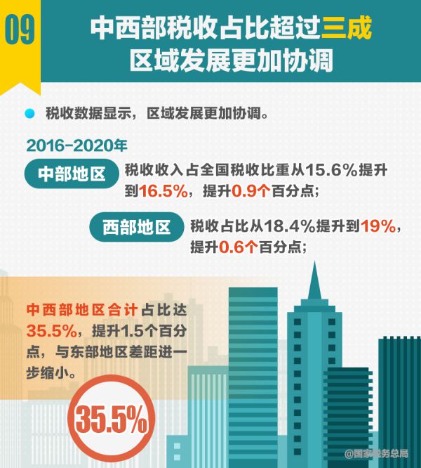 今年的《政府工作報告》提出,「十三五」時期,區域重大戰略扎實推進。稅收數據顯示,區域發展更加協調。2016-2020年,中部地區稅收收入佔全國稅收比重從15.6%提升到16.5%,提升0.9個百分點;西部地區稅收佔比從18.4%提升到19%,提升0.6個百分點,中西部地區合計佔比達35.5%,提升1.5個百分點,與東部地區差距進一步縮小。