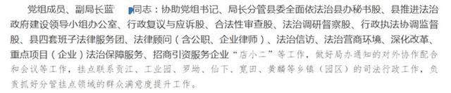 于都縣人民政府網站於2019年11月公開發布的「于都縣司法局領導分工通知」內容顯示,副局長藍育堅的工作分工包括:協助黨組書記、局長分管創滿意之執法為民,統籌法治政府建設和依法行政工作、行政複議與應訴、合法性審查、行政執法協調監督、法律顧問、公職律師、服務工業(企業)、聯繫人大政協、局辦通知的協外(會議)配合等工作……共同分管創滿意之和諧平安、掃黑除惡、社區矯正、安置幫教(無縫對接、遠程會見、戒毒)、維穩、安全生產等工作。共同掛點聯繫貢江、工業園、羅坳、仙下、寬田、黃麟等鄉鎮司法所和法律服務所工作。
