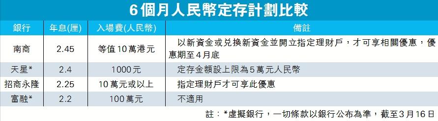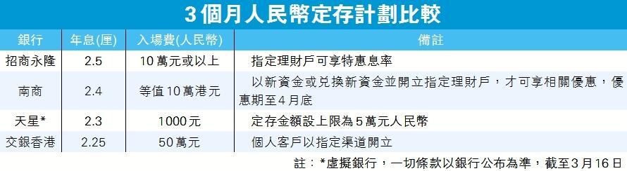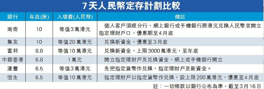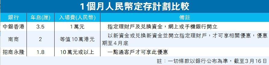 以中銀香港為例,該行客戶須選用「綜合理財服務」,並透過網上銀行或手機銀行,兌換資金1萬元人民幣或以上並開立7天或1個月「特優人民幣及外幣定期存款優惠」,才可享有7天6.8厘高息人仔定存。同時,中銀香港的1個月人民幣定存也是全行最高息,年利率高達3.5厘。