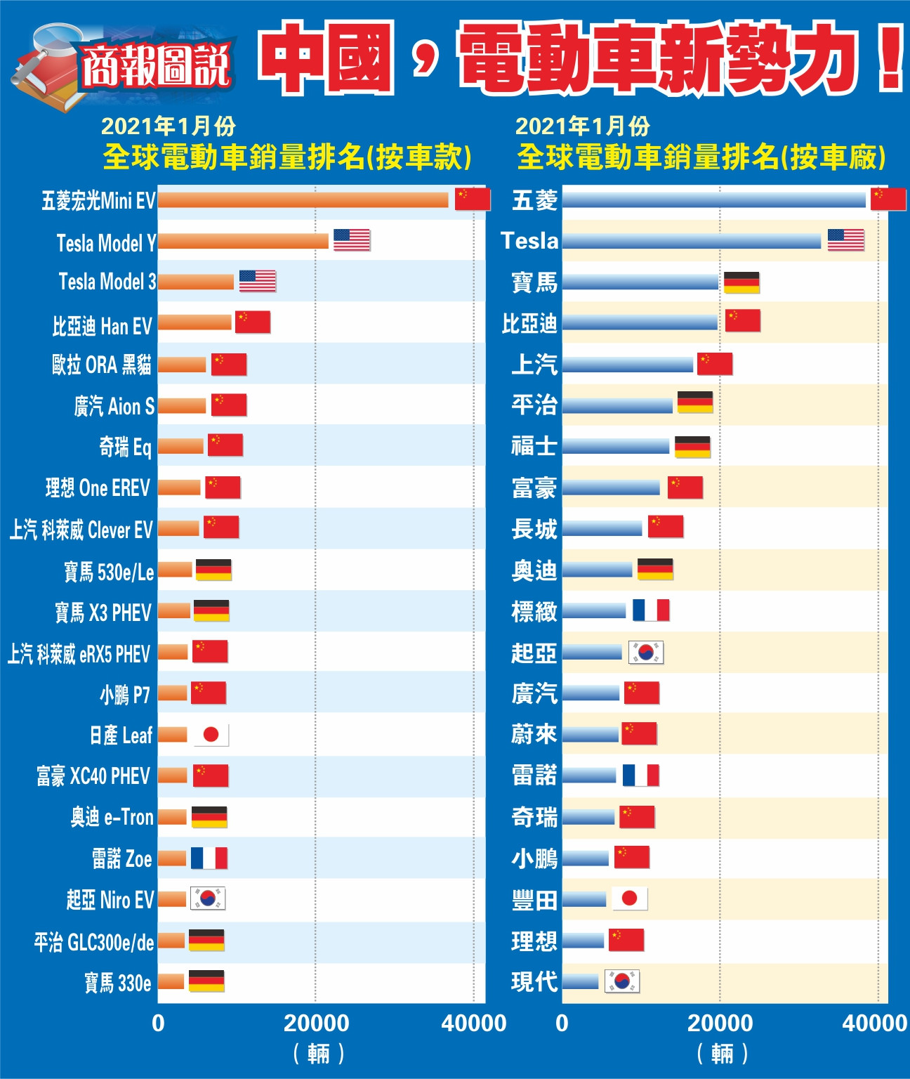 被譽為「國民神車」、去年9月正式開售的國產五菱宏光Mini EV,不單在2021年1月份成為全球電動車銷量冠軍,售出36762輛的成績遠遠超越Tesla Model 3和Tesla Model Y分別所售的21589輛和9597輛,以車廠排名計,更取代Tesla成為新一年全球最暢銷的電動車車廠。