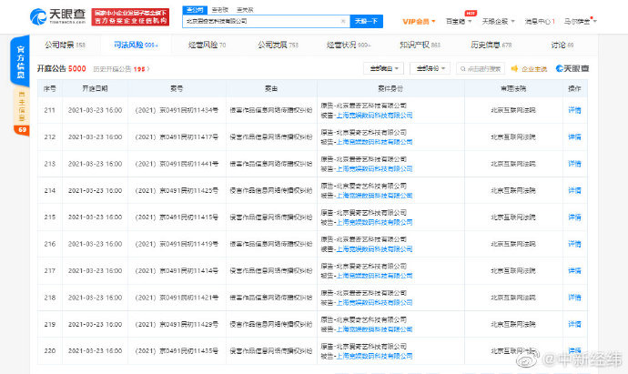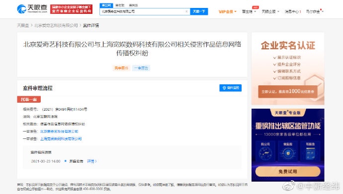 據北京法院審判信息網消息顯示,近日,北京愛奇藝科技有限公司公開與上海寬娛數碼科技有限公司相關侵害作品信息網絡傳播權糾紛案件的開庭公告,由北京互聯網法院經辦。原告為北京愛奇藝科技有限公司,被告為上海寬娛數碼科技有限公司,該案件開庭日期為2021年3月23日。