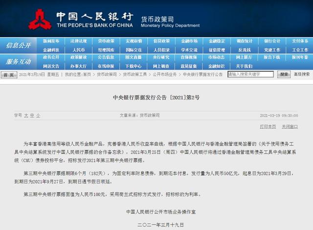 央行指出,第三期中央銀行票據期限6個月(182天),起息日為2021年3月29日,到期日為2021年9月27日,到期日遇節假日順延。第三期中央銀行票據面值為人民幣100元,採用荷蘭式招標方式發行,招標標的為利率。