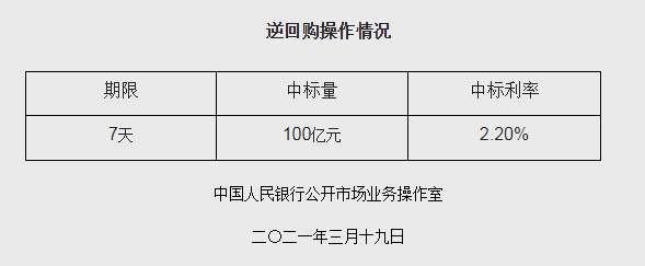 中國人民銀行公布,為維護銀行體系流動性合理充裕,今日(19日)開展100億元(人民幣,下同)7天期逆回購操作,央行表示,公開市場7天期逆回購操作中標利率2.20%,與此前持平。