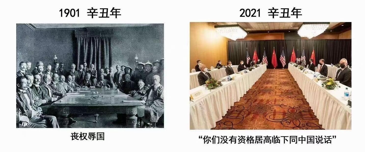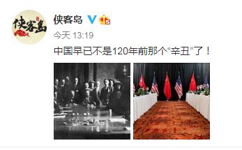 人民日報海外版旗下賬號「俠客島」今日在其官方微博發布兩張照片,並配文字「中國早已不是120年前那個『辛丑』了! 」