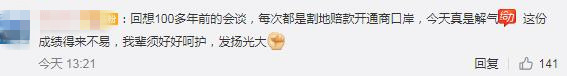 網友紛紛在此微博下留言,有網友稱「回想100多年前的會談,每次都是割地賠款開通商口岸,今天真是解氣,這份成績得來不易,我輩須好好呵護,發揚光大!」