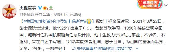 據央視軍事官方微博今日消息,彭士祿親屬透露,2021年3月22日,彭士祿院士逝世。他1925年出生於廣東,曾赴蘇聯學習,1958年接秘密調令回國,隨後出任中國核潛艇首任總設計師。他畢生致力於核動力事業,不求名、不逐利,曾在自述中寫道 「如活著能熱愛祖國、忠於祖國,為祖國的富強而獻身,足矣。」彭老,一路走好!