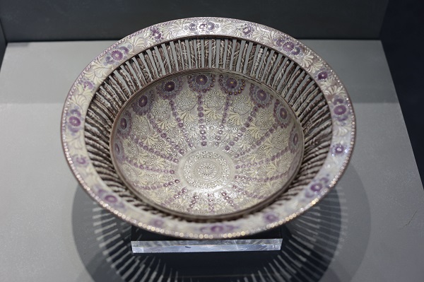 森里秀夫採用了朝鮮陶器常用的裝飾技法「三島」,以人手將花紋印到陶胚上做出浮雕效果後作第一次素燒,再在不同花紋上涂上由匠人親自調配和搭配紫色和淡鵝黃色釉彩。展品榮獲京都舉行2020「京燒・清水燒展」經濟產業大臣表彰殊榮。