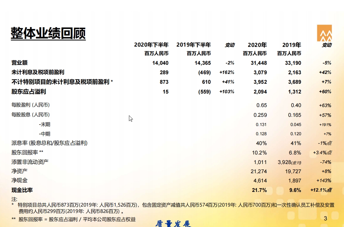 3月22日,華潤啤酒(控股)有限公司(港交所股份代號:00291)發布2020年業績。其2020年綜合營業額為人民幣314.48億元,受疫情影響按年減少5.2%。2020年股東應佔綜合溢利及未計利息及稅項前盈利,按年分別上升59.6%及42.3%至人民幣20.94億元及人民幣30.79億元。現金淨額46.14億元,按年上升143%。董事會建議派發末期股息每股人民幣0.131元,連同中期股息每股人民幣0.128元,2020年度的派息總額為每股人民幣0.259元,按年上升57%。