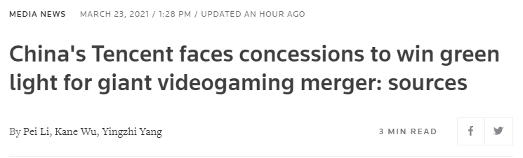一位知情人士告訴路透社:「騰訊在中國的遊戲發行中佔據主導地位,而這兩個直播網站的合併將無異於該行業的巨大發展。」消息人士表示,由於監管機構擔心這項合併將讓騰訊取得壓倒性主導地位,騰訊願意接受有條件的批准。騰訊在中國遊戲發行領域佔據主導地位,而這兩家直播平台合起來將無異於行業裏的巨頭。