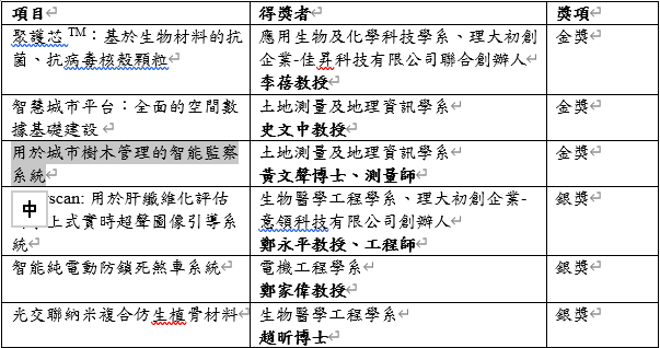 理大續指,6項獲獎發明涵蓋醫療保健、環境監測、智能城市及汽車安全等領域,反映理大在創新與科技研究方面成就卓越。當中聚護芯TM應用於基於生物材料的抗菌、抗病毒核殼顆粒項目;智慧城市平台獲得瑞士日內瓦「國際發明展」金獎,用於全面的空間數據基礎建設項目,及用於城市樹木管理的智能監察系統項目。