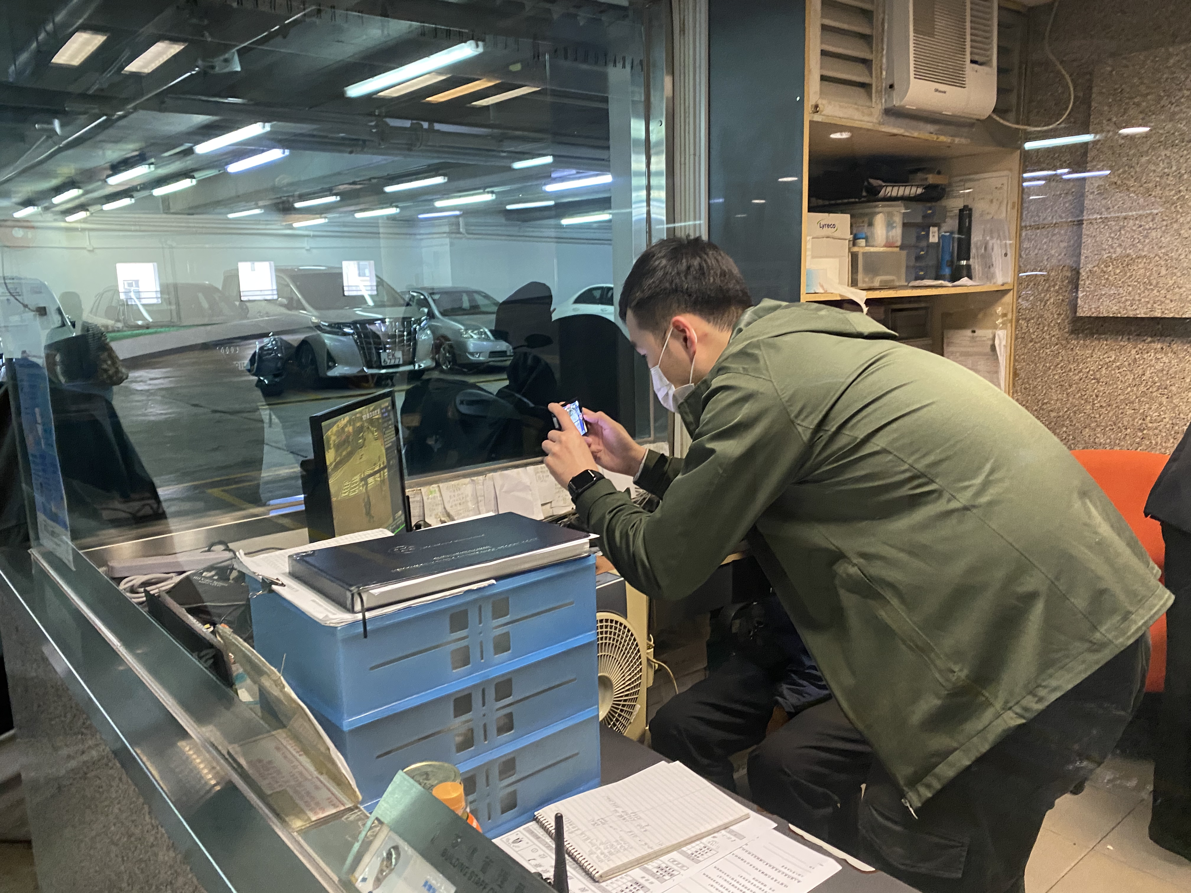 探員在停車場內翻看閉路電視。