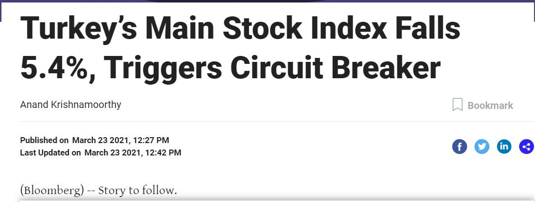 據彭博社報道,當地時間23日,土耳其基準股指開盤大跌5.4%,觸發熔斷。另外,土耳其十年期國債遭拋售,土耳其里拉對美元匯率一度跌至8.4:1。