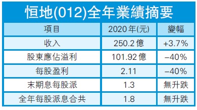 公司每股盈利為2.11元(2019年為3.51元)。股息董事局建議派發末期股息每股1.3元。連同已派發之中期股息每股0.5元,截至2020年末年度合共派發股息每股1.8元(2019年每股亦派1.8元)。跟2019年一樣,恒基去年亦不派紅股。(記者 鄭珊珊)