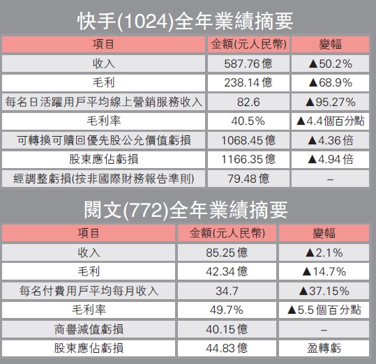 至於調整後除利息、稅項、折舊及攤銷前虧損(LBITDA)為36.16億元,相對2019年錄得EBITDA為35.91億元,由盈轉虧。期內快手平均日活躍用戶為2.65億戶,按年增長50.7%;整體每名日活躍用戶平均線上營銷服務收入為82.6元,按年急增95.27%。