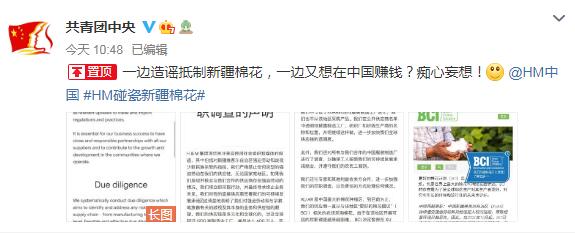 共青團中央官方微博今日刊發多条微博表示,一邊造謠抵制新疆棉花,一邊又想在中國賺錢?癡心妄想!