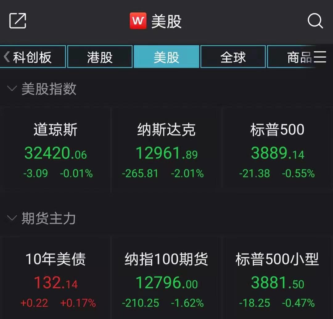 截至收盤,道指跌3.09點,跌幅0.01%,報32420.06點;納指跌265.81點,跌幅2.01%,報12961.89點;標普500指數跌21.38點,跌幅0.55%,報3889.14點。