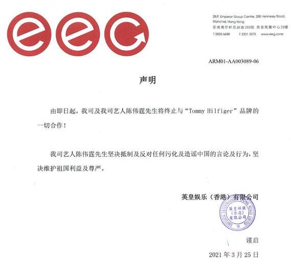 英皇娛樂今日(25日)在社交媒體發表聲明,稱該公司及其藝人陳偉霆將終止與「Tommy Hilfiger」品牌的一切合作。聲明強調,堅決抵制及反對任何污化及造謠中國的言論及行為,堅決維護祖國利益及尊嚴。