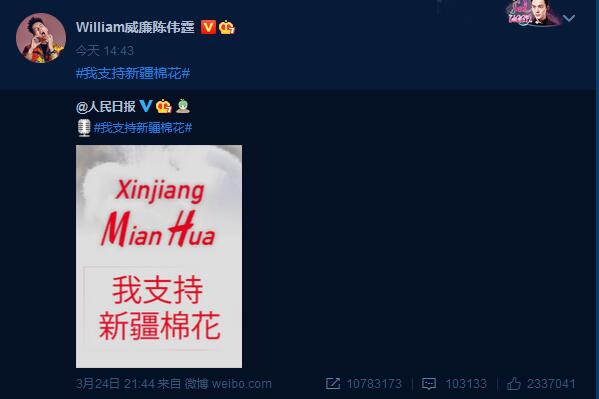 此前,由於部分外國服裝品牌不顧事實,顛倒黑白,妄稱新疆棉花是「強制勞動」的產品並拒絕使用,引起中國民眾的憤怒和抵制。多位代言人紛紛與包括H&M,耐克等在內的服裝品牌解約。