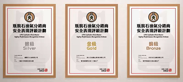 圖為「瓶裝石油氣分銷商安全表現評級計劃」的金、銀及銅級證書。