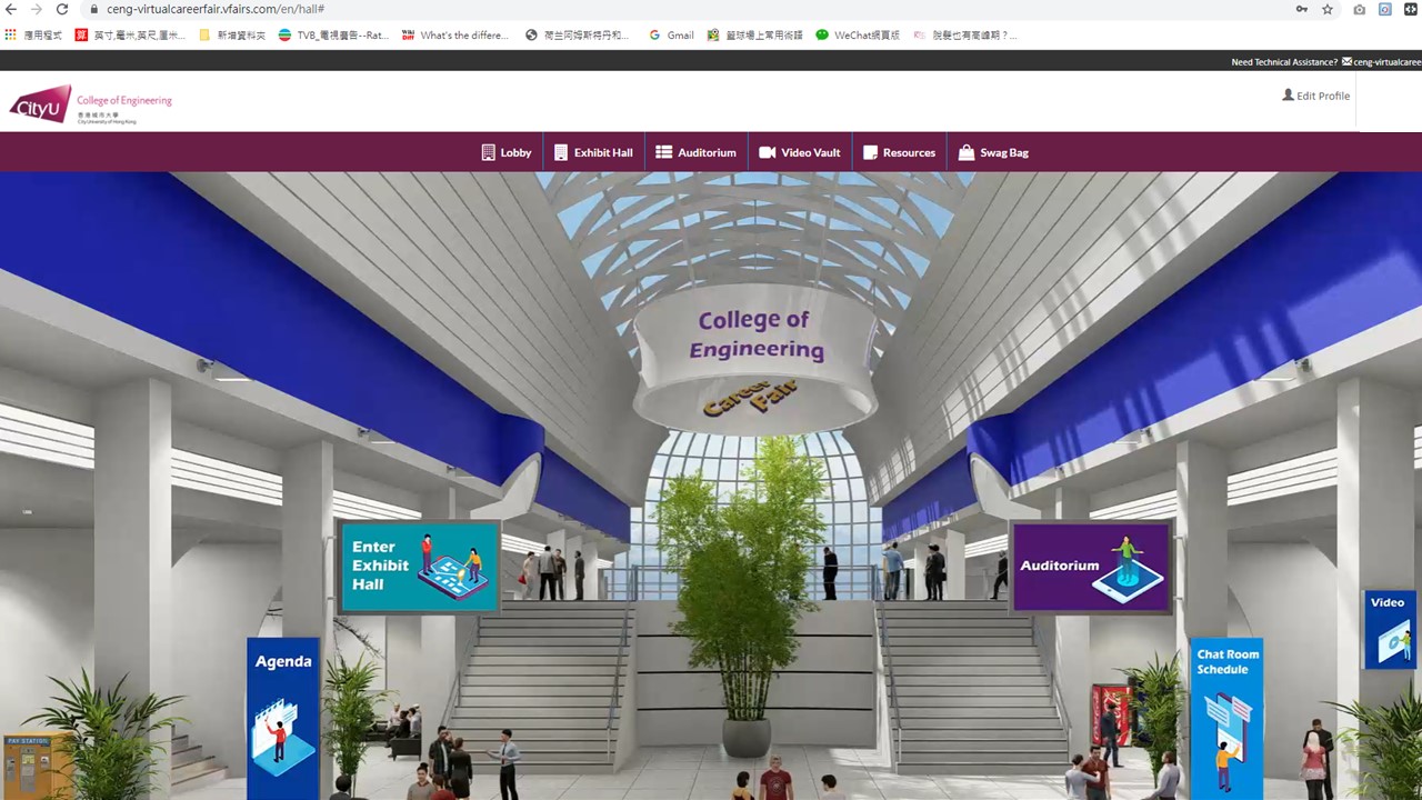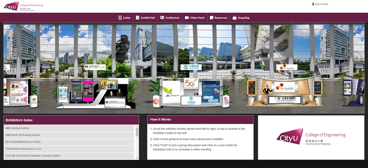 城大提醒工學院學生只需進入工學院虛擬職業博覽會進入網站 https://ceng-virtualcareerfair.vfairs.com , 再輸入學生帳戶戶口資料,即可參加博覽會;學生在活動完結後可隨時翻看企業錄像及資訊,網站更設有電子資料夾,方便學生把企業資料電郵給自己及轉寄予朋友。
