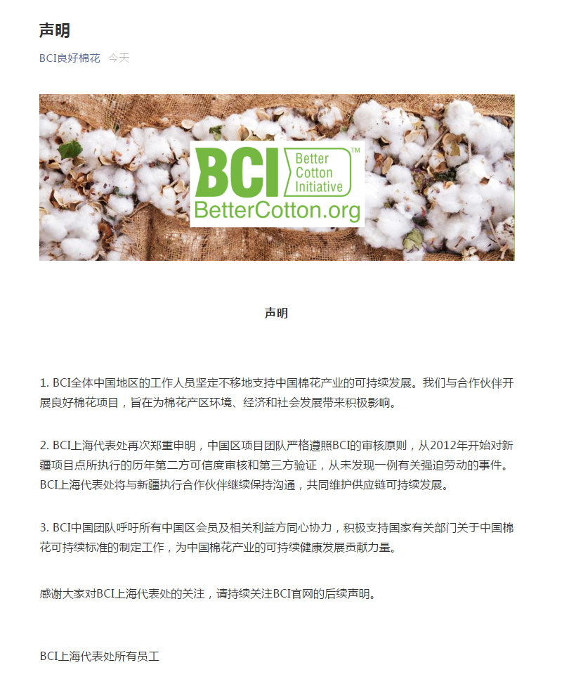 2. BCI上海代表處再次鄭重申明,中國區項目團隊嚴格遵照BCI的審核原則,從2012年開始對新疆項目點所執行的歷年第二方可信度審核和第三方驗證,從未發現一例有關強迫勞動的事件。BCI上海代表處將與新疆執行合作夥伴繼續保持溝通,共同維護供應鏈可持續發展。