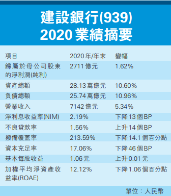 行長王江表示,去年,建行發放貸款和墊款淨額較上年增加1.69萬億元,同比多增5138.59億元。其中,製造業貸款、基礎設施貸款、綠色貸款增速分別為19.81%、17.66%和14.20%。2020年末,該行普惠金融貸款餘額1.45萬億元,較上年增加4892億元,餘額新增均列市場第一。展望2021年,建行表示擬促進數字化經營提質升級,提升場景生態平台運營能力,並完善全面主動智慧的現代化風險管理體系和內控合規長效機制。