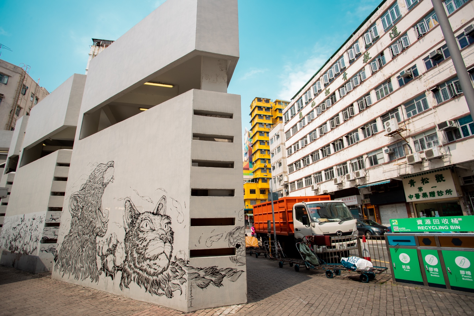 深水埗不少店舖都有貓店長駐場幫忙招待顧客,根據非正式統計,該區約有500位貓店長。由舊式商店至文創小店,這些毛茸茸的可愛店長各具性格,更擁有各自的粉絲和生活故事。本土藝術家Kristopher Ho捕捉此一社區特色,聯同非牟利組織「城市的盼望(Hope of the City)」及一班義工青年,合作繪製一幅黑白、長逾20米的壁畫《人人和喵dd》,繪上他對貓店長的印象,畫作背景上的棉花,更呼應著深水埗的布料行業。掃描牆上的二維碼,可觀看曾跟隨日本攝影師橫浪修學師的導演Bobyea為貓店長拍攝的影片《喵水埗》,讓觀者跟隨貓店長腳步,以貓眼視角探索深水埗新舊小店間的緊密連繫。