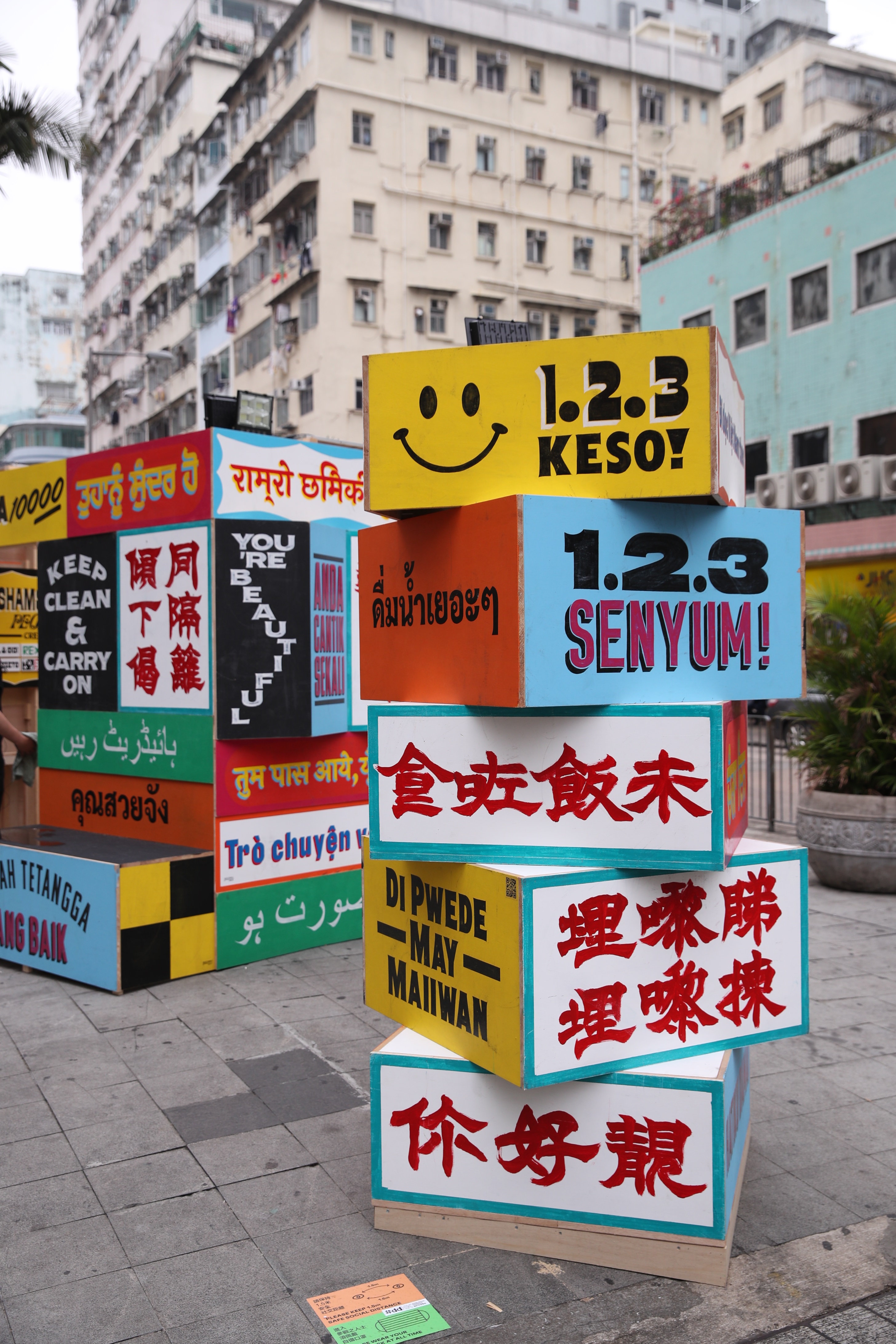 南昌街休憩處設計裝置以「聊天起居室」作主題,用中國書法呈現不同語言的標句。
