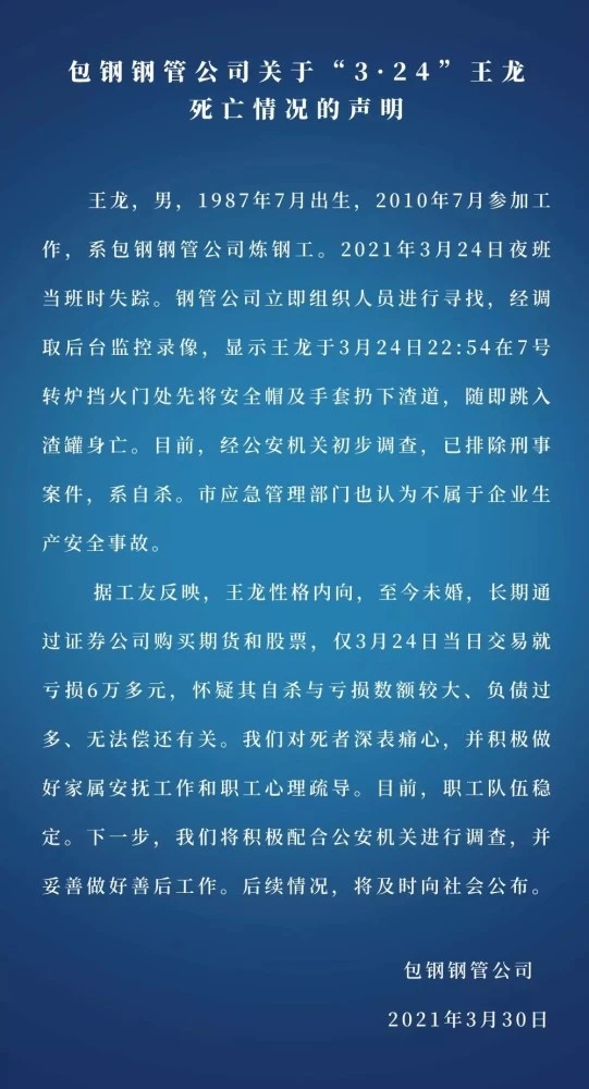 聲明提到,該員工系包鋼鋼管公司煉鋼工,2021年3月24日夜班當班時失蹤。監控錄像顯示該員工於3月24日22:54在7號轉爐擋火門處先將安全帽及手套放在下渣道,隨即跳入渣罐身亡。目前,經公安機關初步調查,已排除刑事案件,系自殺。應急管理部門也認為不屬於企業生產安全事故。