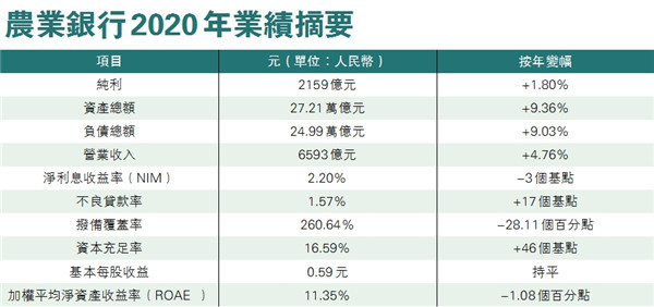 農業銀行(1288)去年多賺1.8%至2159.25億元(人民幣,下同),營業收入增長4.76%,淨利息收入增長8.82%。截至2020年末,農行個人客戶總量達8.6億戶,個人存款餘額11.9萬億元,個人貸款餘額6.2萬億元,創近三年最好水平。派息為每10股派1.851元,預計派息647.82億元。